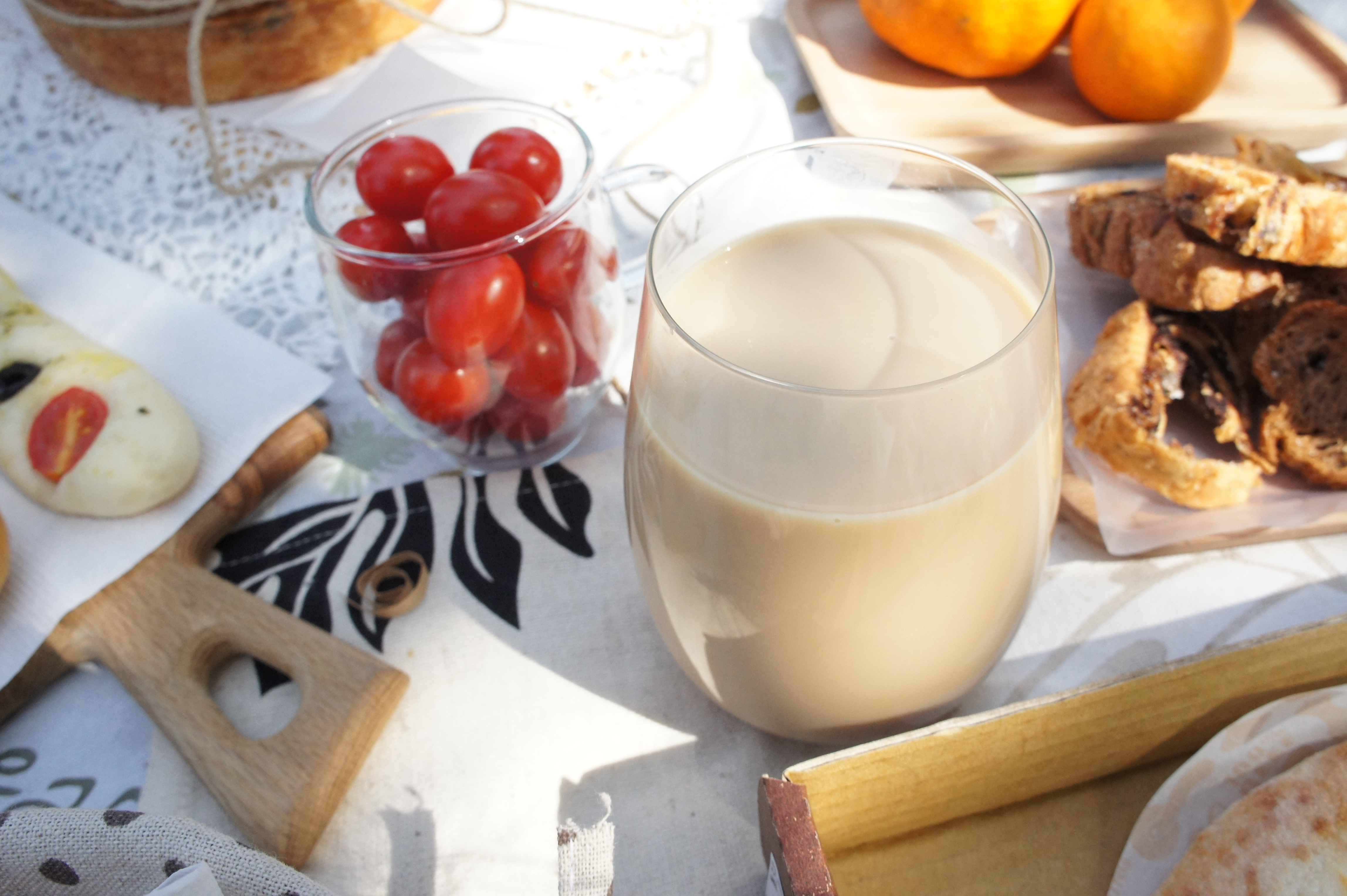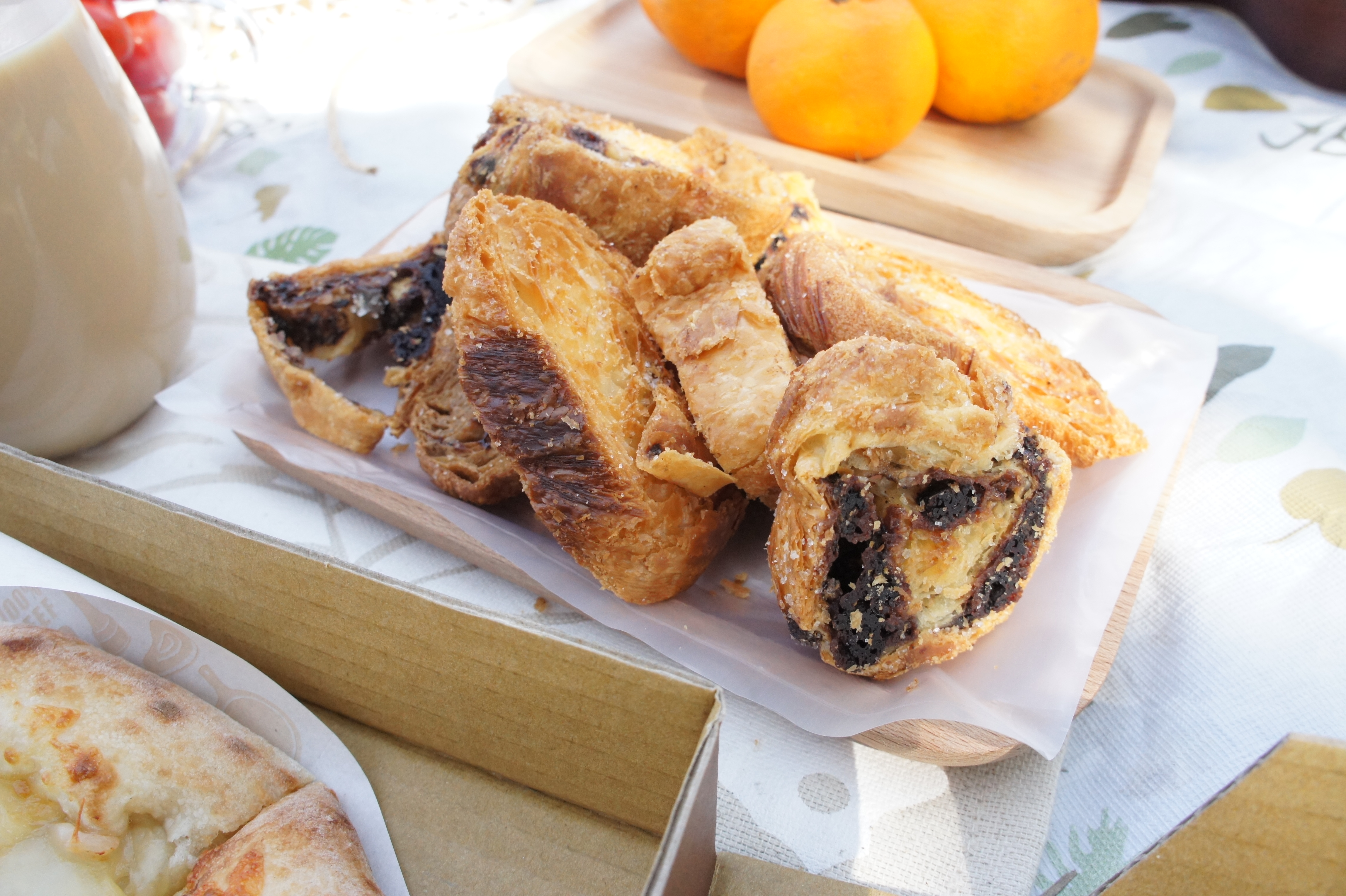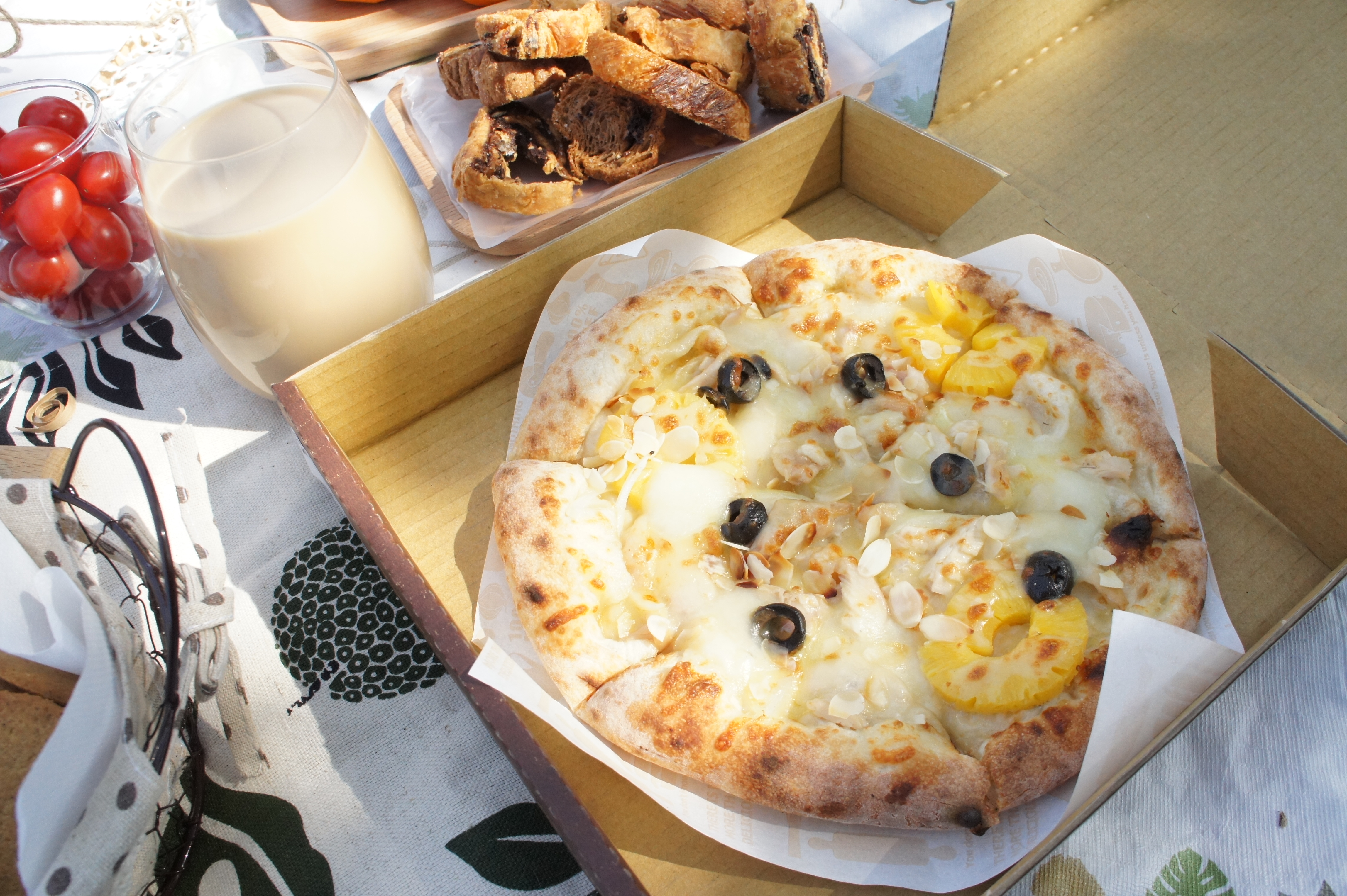 左邊這位西嘛西是以愛天空品牌人物為形象做成的可愛麵包,討喜的麵包造型一臉「買我買我」的樣子,蟲蟲造型的麵包實在太可愛,為了跟親近大自然的野餐形象搭配,於是就手滑了,完全是任性之下的產物XD除了造型可愛之外,外表撒上甜甜糖粉的西嘛西嘛其實也很好吃呢!小朋友的話一定會很喜歡這個~ 一系列的甜食之後來點鹹食吧!愛天空的蕃茄橄欖佛卡夏,在抹著香蒜奶油的佛卡夏上排列黑橄欖及小蕃茄,灑上義式料理常用的巴西利香草,天然食材的配色讓人食慾大開,兼具味覺與視覺的享受,充滿濃濃的義式風情~ ▲路易莎咖啡-太妃糖奶茶 $50