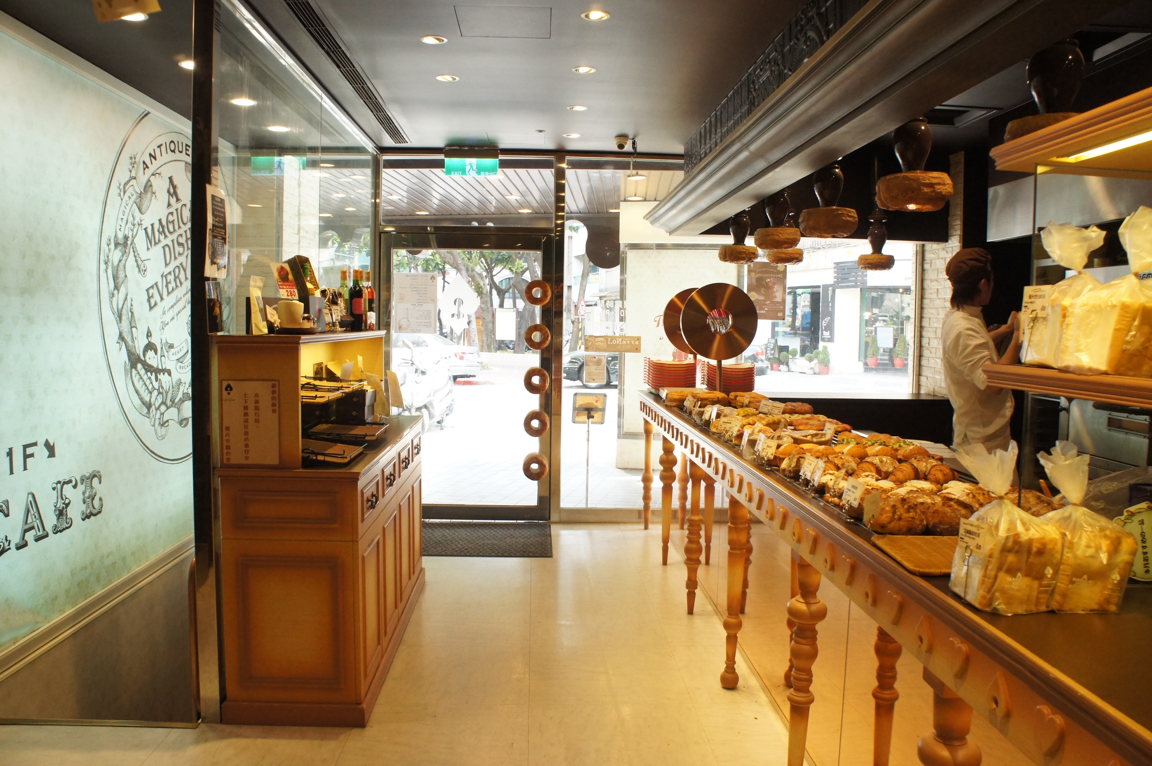 來自日本愛知縣的ANTIQUE品牌,將麵包跟甜點中都施了魔法,希望帶給客人心動的美味,在開放式的烘焙空間可以看到師傅們烘焙麵包的過程,麵包都是店內現做的,新鮮看的見!麵包價格落在30-180元左右,店內也不時會提供試吃。這次因為野餐的關係,買了幾個比較大型的麵包,幾個人分食下來一點都不貴唷,當然不能錯過魔幻巧克力圈,魔幻巧克力圈可是愛天空的招牌!(門把上的麵包裝是就是魔幻巧克力圈~)