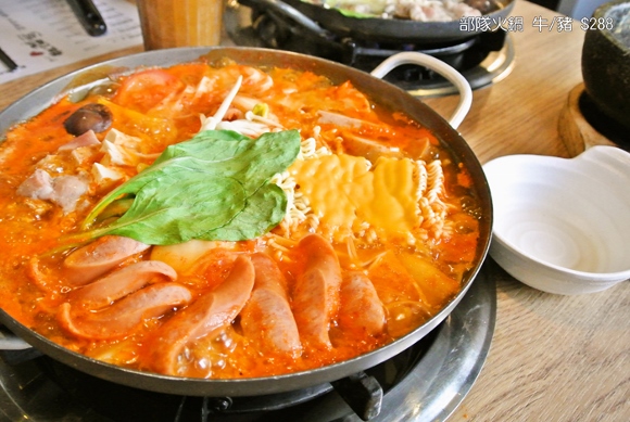 「部隊鍋」是韓戰後物資短缺,居民用美軍剩下的香腸火腿料理的一種火鍋。