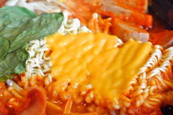 後來才演變成在鍋裡加入各蔬菜、肉片、還有cheese和拉麵。