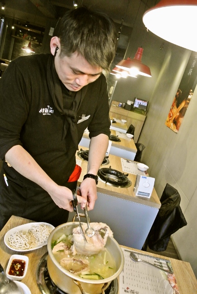 一隻雞送上餐桌後,服務員會把雞肉剪開再滾煮3-5分鐘,把精華都釋放在湯裡面。煮開後的湯汁是甘甜醇厚的,有一種開心農場的味道!