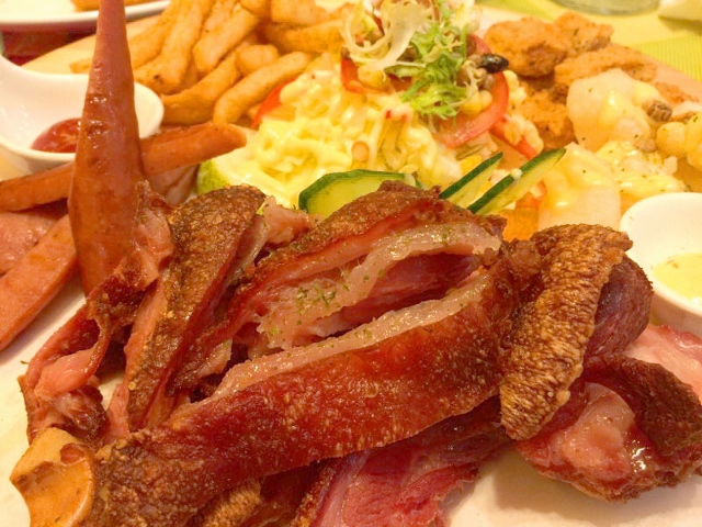 焗薯泥火腿:自製創意改良,火腿上加入自製薯泥+PIZZA乳酪絲在一起焗烤,薯泥把火腿的油膩蓋住了,變得比較爽口,乳酪絲的香氣也蓋住一點火腿原有的膩味,讓女生會比較願意嘗試吃!