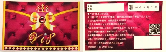未來荷亞也會推出VIP卡←免費辦卡,累積金額達10000元即可升級為VIP !