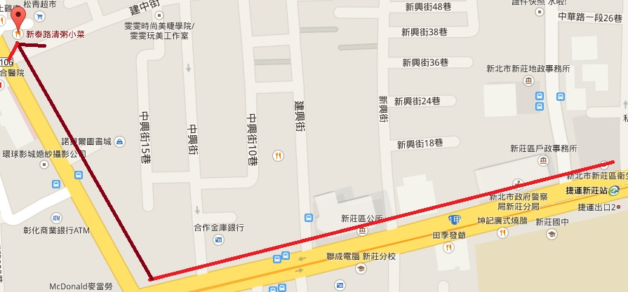 新莊捷運站一號出口右轉一直走,到新泰路口(眼鏡行)右轉