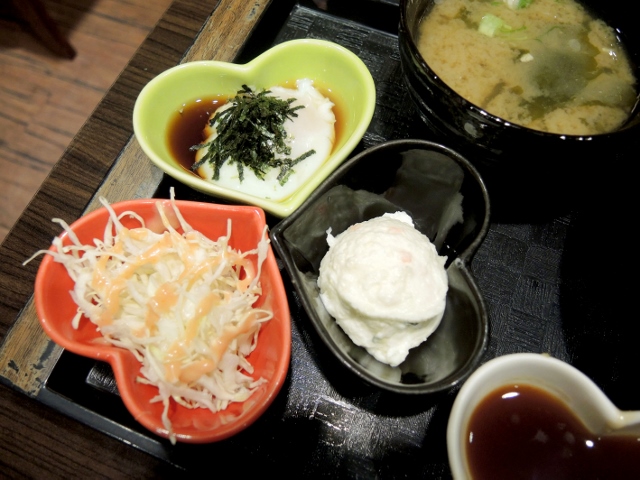 心動套餐有附上馬鈴薯沙拉與溫泉蛋,高麗菜絲和味增湯則是單點就附的小菜。