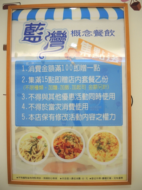 到藍灣:『憑卡來店消費義大利麵或燉飯現折10元。』