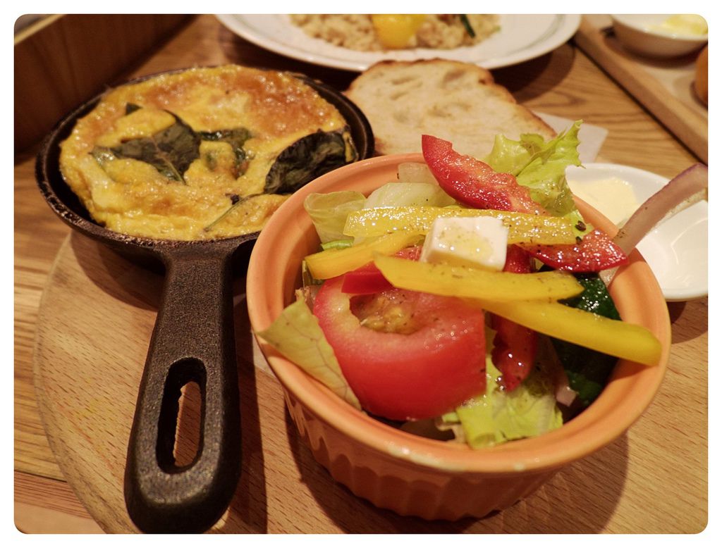 烤蛋附的沙拉以美生菜、甜椒為中心,裡面還罕見地加了莫札瑞拉起司(乍看以為是豆腐XD