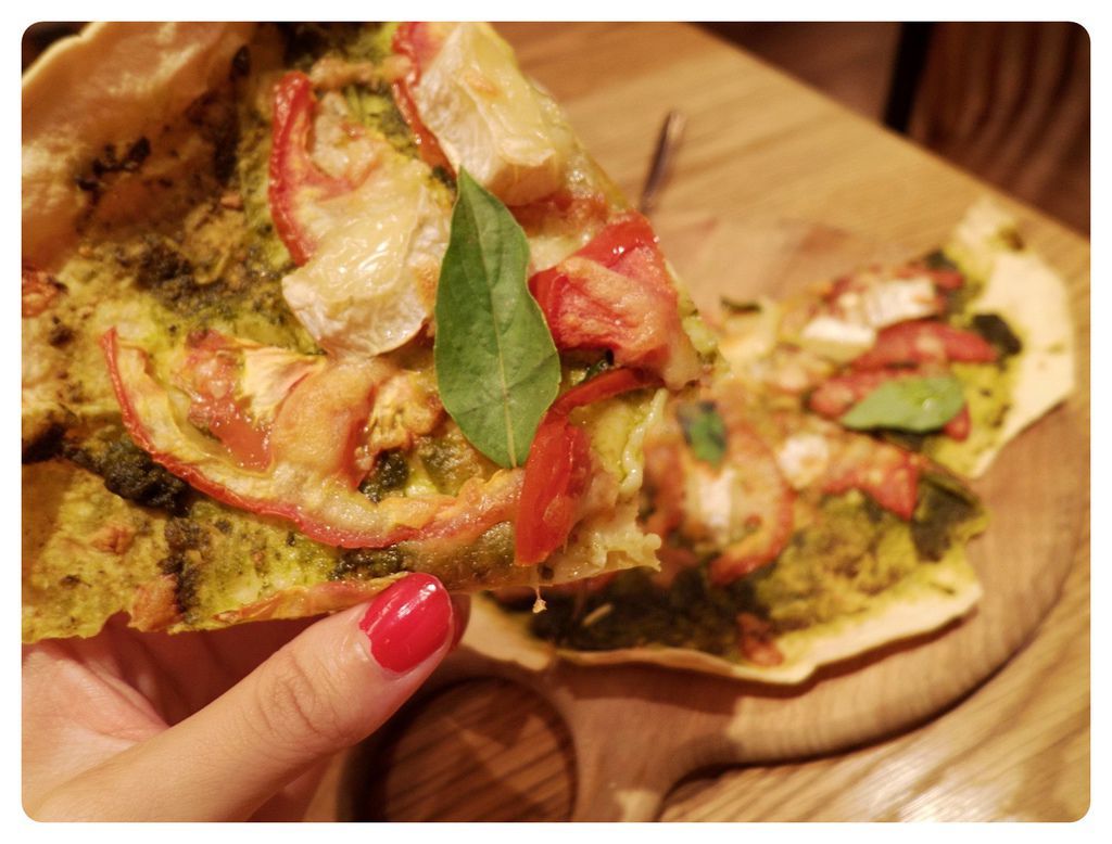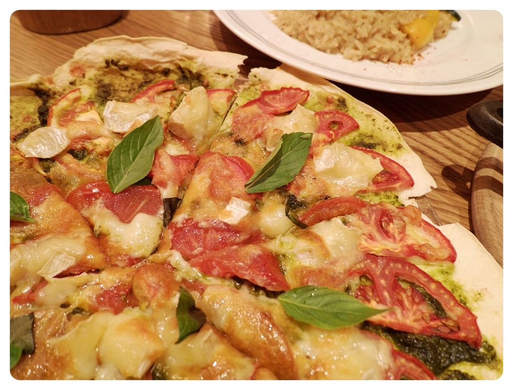 這款僅僅加了牛番茄、九層塔、起司絲、卡門貝爾起司的簡單薄餅