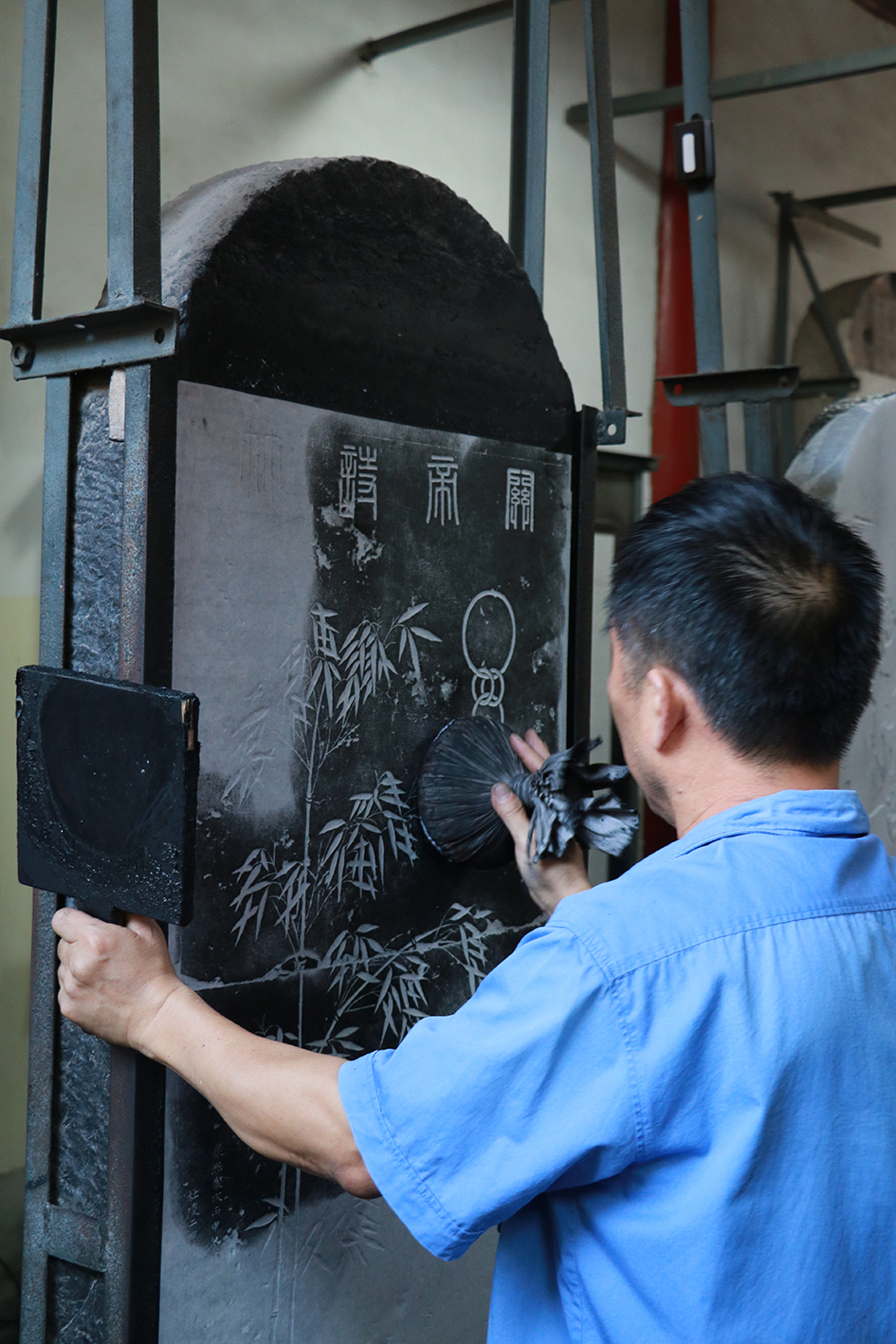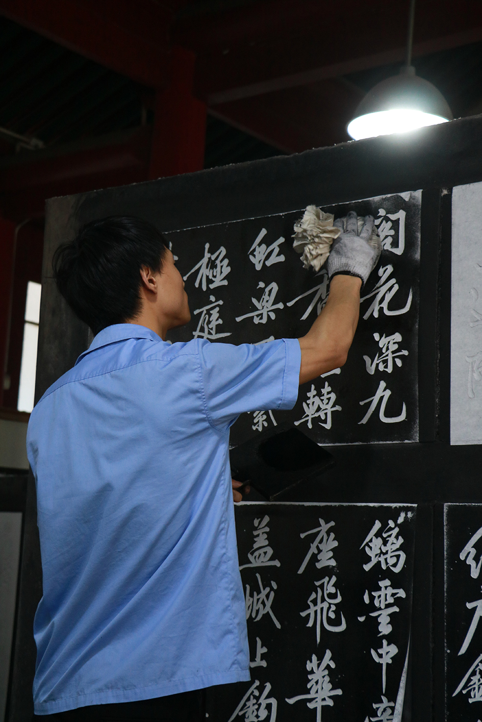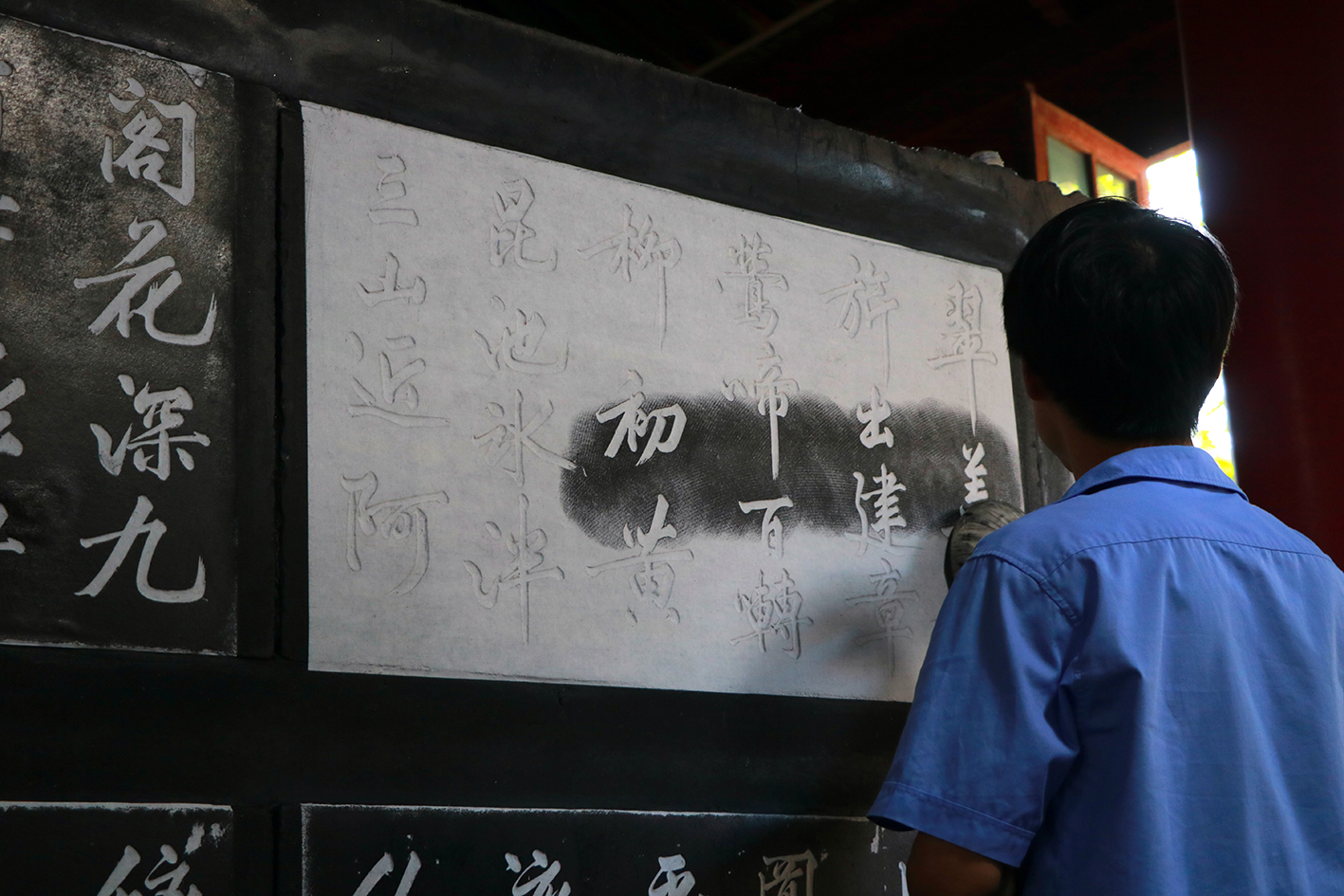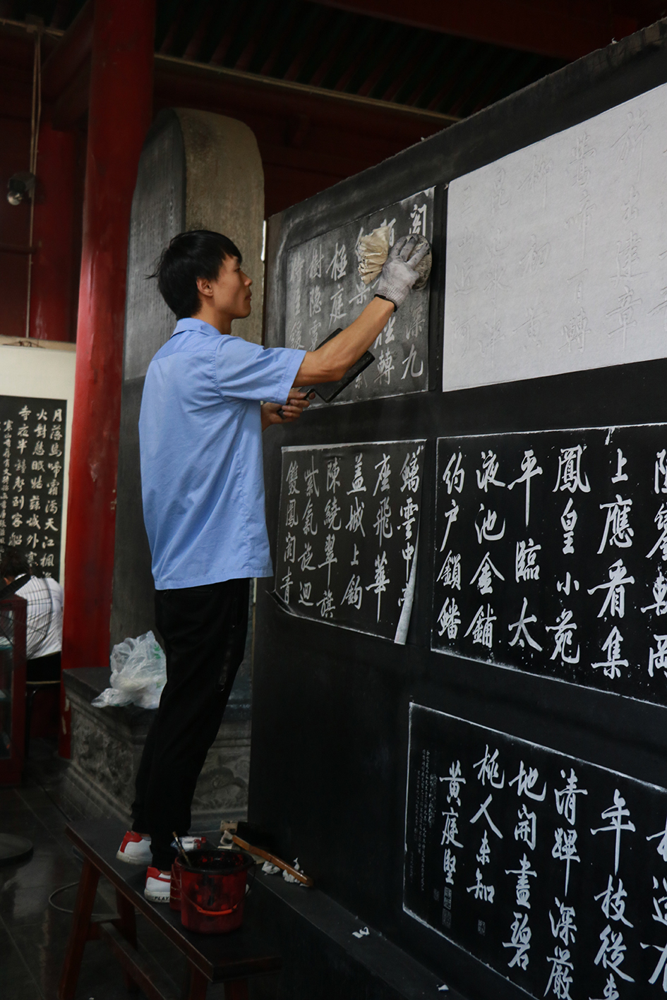 我和內人都非常喜愛旅行,因此,當我們在西安旅遊時的第三天我選擇一大清早趁家人還在睡覺時,我獨自搭計程車前往碑林。當天的清晨讓我感到格外舒適。碑林是一個保存了大量古代碑刻的地方,我一直想親眼見證這些歷史文化的傳承。當我到達碑林時內心充滿感動,此時從隔壁展廳傳來啪~啪~啪的拍打聲,原來是有人正在拓碑我佇立在一旁靜靜的看著。他們非常專業,將紙張蓋在碑刻上噴上些水,再用棕刷在紙上刷平,接著將貼在背上的宣紙輕敲,明顯看到紙張有字的地方凹下去,再將拓包礁上濃墨,不到一會兒黑底白字的拓碑作品完成。看到這些人膽大心細且熟練的操作技巧,我內心不由得充滿了感動。