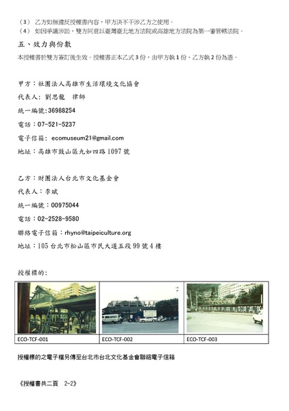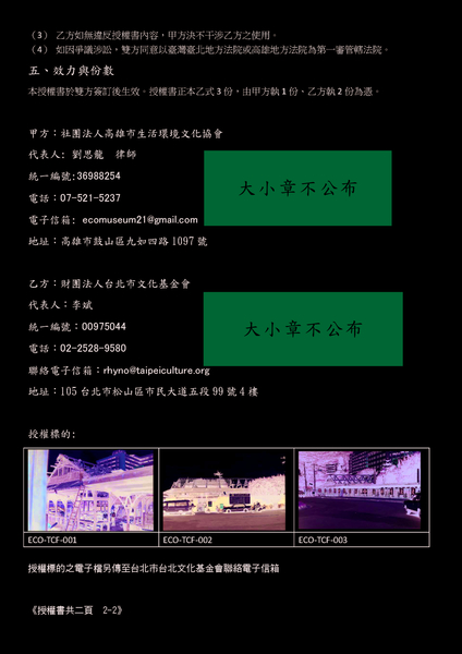 (2) 為貫徹公益授權,本授權書於雙方用印之後,甲方將公佈於甲方所擁有之網站https://blog.udn.com/ecomuseum,乙方不得有異議。