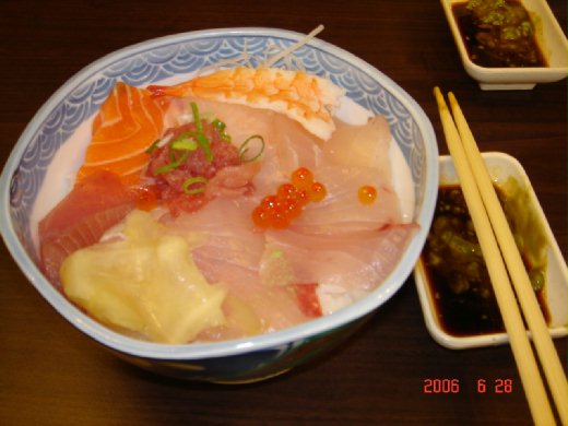 先上來的是傳說中的生魚片蓋飯,共有7種魚,我指認得鮭魚、鮪魚、鮪魚茉肉、蝦子、鮭魚卵,其他的白魚片就不知道了。