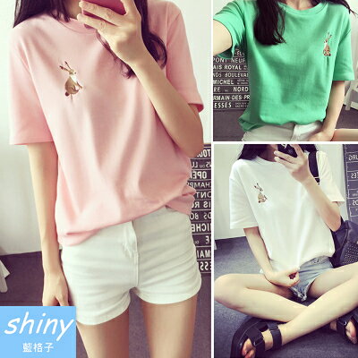 出自:線上購物分享 - 399超商免運 599折30 輸入代號 M7OJ-IPQJ-ZB18-R5YO【V0982】shiny藍格子-輕尚休閒.純色刺繡兔子圓領寬鬆短袖上衣