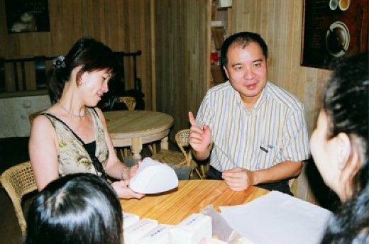 話說整個茶館內,只見台南地區的五、六茶館老闆、員工及家人,男女老小總動員,褶紙的褶紙、蓋章的蓋章,量茶的量茶,中間則見桂花堂的主人蔡兄很細心的報導一桌子的人如何包手工四兩包,現場燈火通明、挑燈夜戰,這一幅畫面,又勾起我無限的回憶,這不是昔日大稻埕茶行外銷出口的翻版嗎?