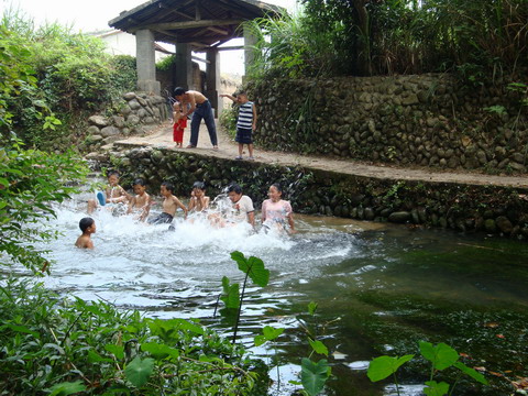 這次拜訪武夷山,在一個農家宴場所,地名是「小竹林」,不僅其留下的竹林有如溪頭般形成竹林隧道,而竹林旁進入小村莊必經之處,剛好是一條小河流,更難得的是河水實在是清晰見底,於是在下午時分,出現了一群放暑假的小朋友,只見她們、他們興奮地在水裡悠遊、相互打水戰,還成改群結隊,來個水戰大賽,就站在那裡看了許久,腦海中似乎回到小時候的種種…〃。
