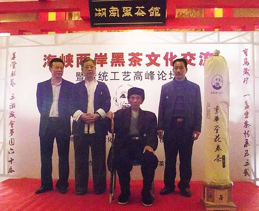 圖為廣州維多利湖南黑茶館總經理肖強、曾至賢、李華堂以及李華堂的兒子李鶴其合影。 |