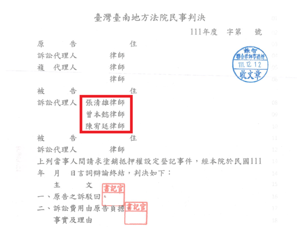 高雄律師推薦張清雄(07)2728828-客戶塗銷抵押權設定登記事件一審勝訴案例