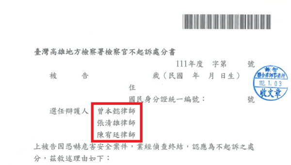 高雄律師推薦張清雄(07)2728828-客戶恐嚇危害安全案件不起訴勝訴案例