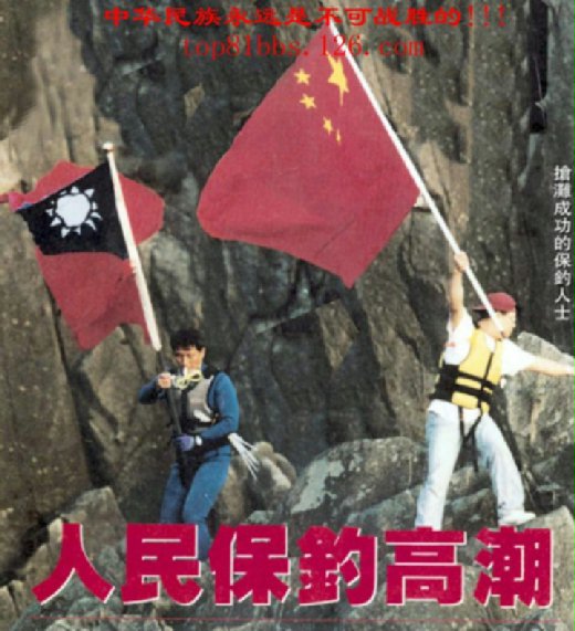 台灣的怎麼樣,台灣的政府幹什麼?不但把日本船放走,又揚言要法辦漁民,一百位漁民企圖闖關。所以我們大家看到,漁民火了,就覺得政府這麼混蛋,這麼膽小啊!欺負自己人。然後看到台灣的漁民,日本經過這個強悍的驅離,今年的魚獲量要少到三分之二,然後漁民說,半個月以內,如果你這個鬼政府沒有作為,漁民揚言改掛五星旗。為什麼呢?掛了五星旗以後可以保護我們。大家不要忘了,五星旗當年曾經掛在釣魚臺上面,看到沒有,當時插的五星旗,保釣運動的行為,在釣魚臺上面,撐起了台灣和中共的國旗。台灣的民進黨秘書長邱義仁認為什麼呢?這個是看到沒有,是主權被出賣,台灣的建國黨跟民進黨說,五星旗插在釣魚臺,是台灣的主權被出賣。請問插上日本旗,是什麼主權被出賣?插日本旗就不是被出賣了?插上中國的旗就台灣被出賣了,那你台灣旗插上去啊,你台灣說你所謂的什麼青天白日旗啊,你有本領插上去啊!又插不上去。被插日本旗,他們不囉嗦、不講話,被插上五星旗,看到沒有,插上五星旗,他們就有意見,說是台灣主權被出賣,你台灣哪來的主權,今天日本與釣魚臺來劃經濟海域,一劃劃了兩百里,劃了你家門口,你不能劃回去,不敢劃回去,你的漁民被人家欺負,屬於你的釣魚臺也被人家搶走了,不是嗎?