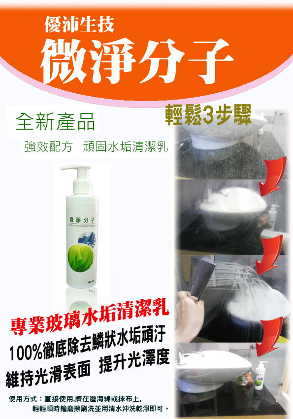 惱人玻璃水垢救星! 優沛-微淨分子 Scratch free powerful cleaner 符合衛生署食品用洗潔劑衛生標準(衛署食字第0960404499號),不含甲醇、砷、重金屬、壬...