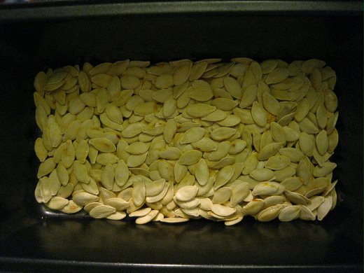 6) 利用烘焙空檔,洗淨南瓜籽,利用烤箱餘溫,做成南瓜瓜子,如下圖。