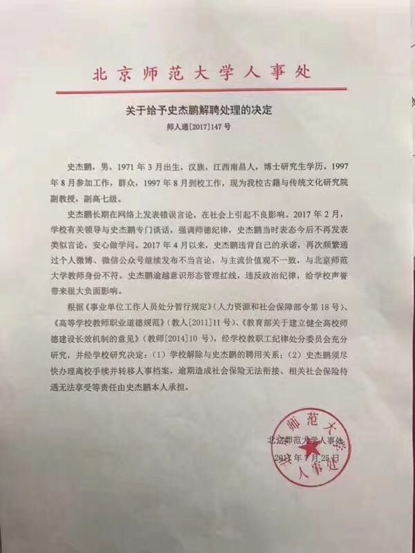 根據網路流傳的「北京師範大學人事處」公告,北師大古文與傳統文化研究院副教授史杰鵬在7月25日被解聘,因為他長期在網路上發表錯誤言論,在社會上引起不良影響;這些不當言論與主流價值觀不一致,與北師大教師身分不符,「史杰鵬踰越意識形態管理紅線,違反政治紀律,給學校聲譽帶來很大負面影響。」