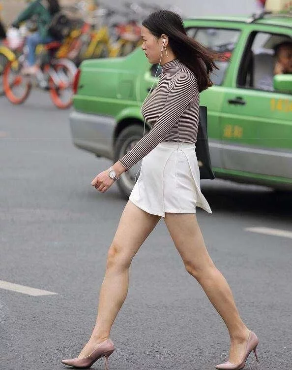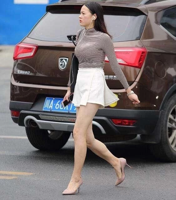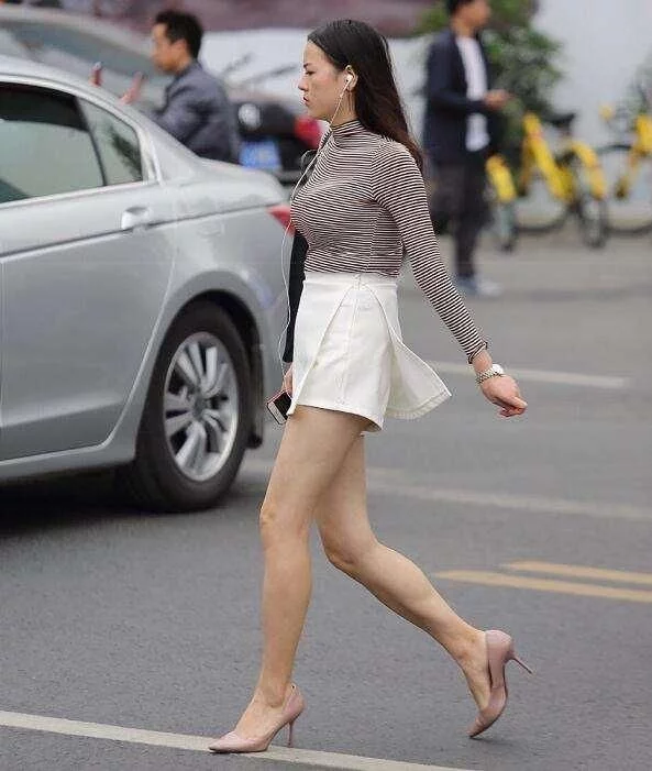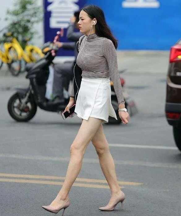路人街拍,小姐姐好身材,时尚穿着,显完美上围。这位美女,穿着一件条纹的长袖上衣,修身的款式显示出完美的上围,搭配着一件白色的短裙,很潮流的穿衣风格。