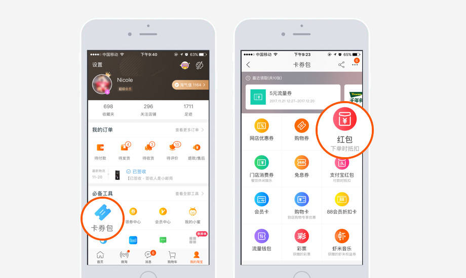(1)红包数量及更多红包详情请登陆“手机淘宝-我的淘宝-卡券包-红包“进行查看。