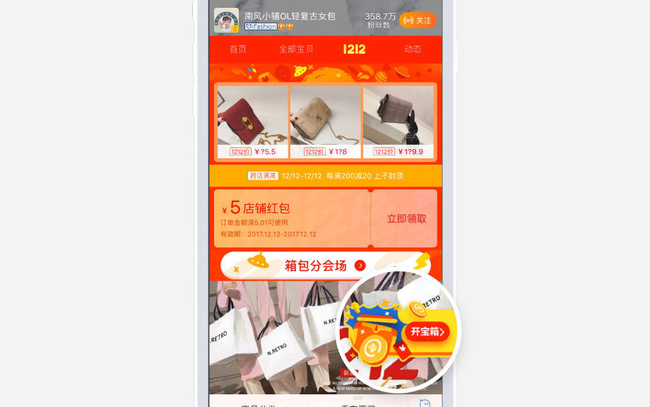 (2)2017年12月1日-12月12日期间,宝箱将随机展示在2017年淘宝双12活动卖家店铺的淘宝双12活动承接页面。淘金币宝箱透出示例如下(仅供参考,最终样式以实际页面为准):
