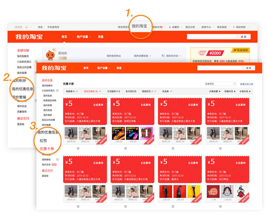 5.店铺大额渠道优惠券领取后直接发送到用户的淘宝账户,用户可登录: