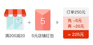 (一)店铺红包与跨店满减使用顺序。A店铺满减档位为满200元减20元,若订单金额为250元,消费者有1张5元店铺红包,则可抵扣金额和抵扣顺序为,先抵扣5元店铺红包,再抵扣20元跨店满减。