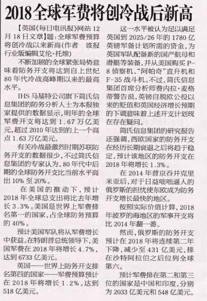 英国简氏防务预算报告预计,全球国防总开支在2018年将达1万6700亿美元,这将是冷战后全球军费的最高水平。