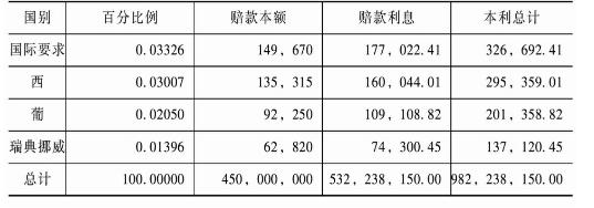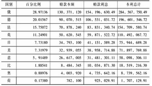 (二)辛丑和约第六款(即关于赔款内容)的分析.按照辛丑和约第六款所列,其中最重要之点,可分为下列六项。(1)赔款总数之规定。按当时各国所要求之数,沙俄以调军较多,列为第一,德国以公使被杀,列为第二。其所开之数,据和约上所载,表面上系“各国各会各人及中国人民之赔偿总数。”(此处所指中国人民是指教民,可参阅外部奏核销办结京内教案收支各款数目折。)(5)且以各国武官之刁难,几经磋商,始削减畸零,将原来所提出之四万六千零二十九万六千三百九十三两,定为四万五千万两整数。(2)各国分得之赔款数目表(单位海关两,利息系照年息四厘计算):
