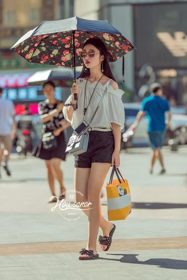 白色的蕾丝边吊带一字肩搭配黑色直筒短裤,脚踩波点蝴蝶结拖鞋,夏风中带着一丝甜美俏皮。黑白配不只是经典或是沉闷,不同单品会有不同的穿搭风格。做自己就好!