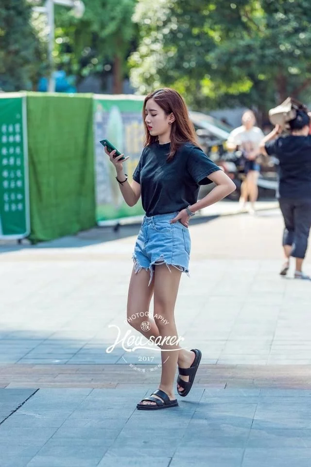 黑色T恤搭配毛边牛仔短裤,夏季日常出街穿搭,简简单单,清清爽爽,小姐姐的颜值很美!