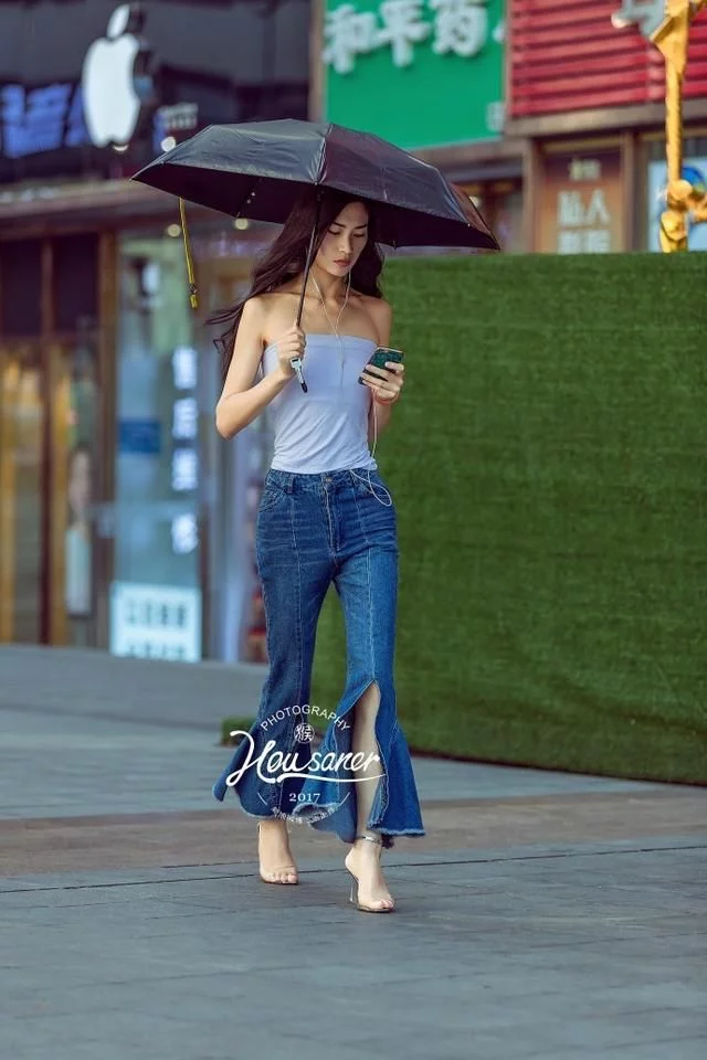 纯浅蓝抹胸清爽简约,搭配硬朗的微喇开衩牛仔裤,别具一格地凸显了纤细与高挑。脚踩一双透明质感的一字“冰块跟”。感觉就是T台上的最耀眼的麻豆了~