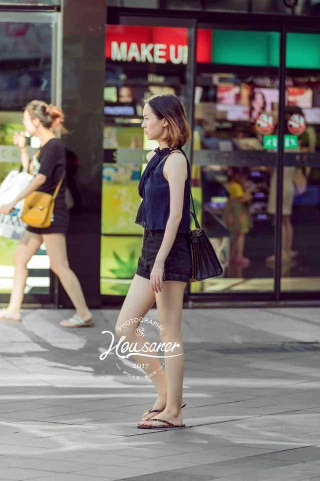 百褶的藏蓝色挂脖小背心搭配黑色卷边短裤精致小巧。波西米亚风格的人字拖异域度假风情增添。这种长度的头发看着感觉很舒服,你觉得呢?