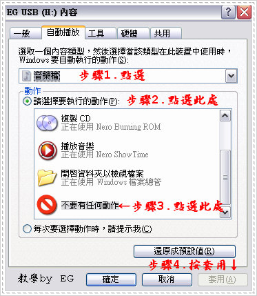 專家建議,執行USB裝置時,暫停自動播放功能,像是可在插入USB裝置,同時按住Shift鍵不放,以避免遭受USB病毒感染;或是進入「我的電腦」,右鍵點選USB裝置後選「內容」,再點選自動播放標籤,針對四種不同的內容類型都選擇「不要有任何動作」,即可停用自動播放。