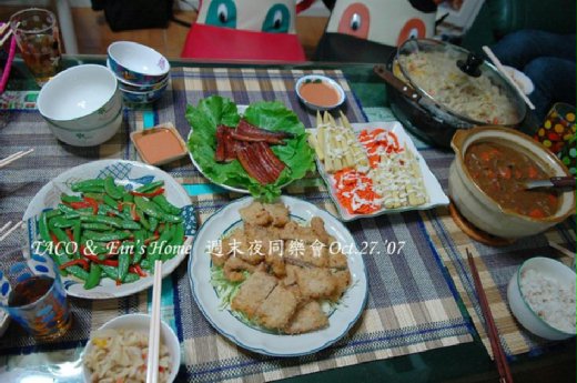 ★其實我很想用盤子把主食一份一份盛好,擺上小玉米紅蘿蔔等配色的蔬菜,就會是平時TACO大爺常吃的菜色。無奈,桌子不夠大,沒辦法一份一份的把餐盤 / 餐墊 / 餐具 / 杯子等全都擺得美美的。十幾個人的餐墊跟餐具,得要一條大型的長桌啊!