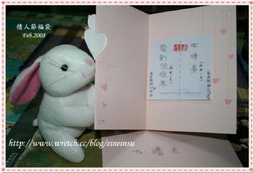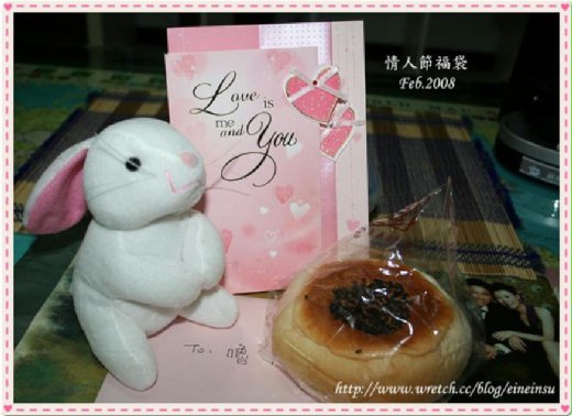 ↓↓↓我的情人節福袋內容物:一隻純白+粉紅色長耳朵的小兔、一個我最愛吃的紅豆變貓、還有一封卡片。
