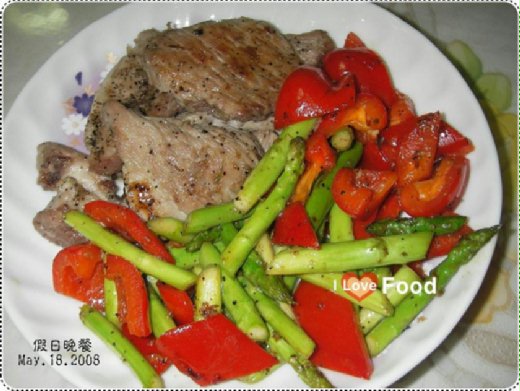 煎豬排&甜椒炒蘆筍是分別做的兩道菜,但是兩人份份量少,並肩放在同一個盤子裡即可。兩個菜沒放半點油,就可以醬子油亮香甜,夠健康了吧!