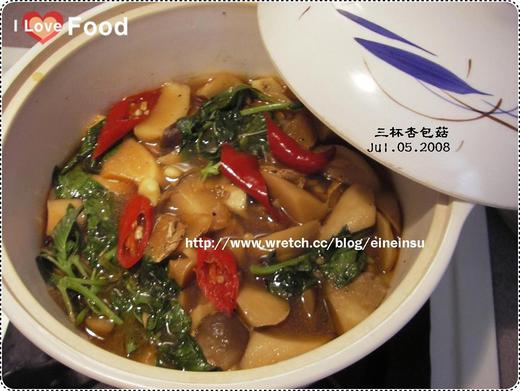 就是一般三杯雞的作法,很容易。但是菇類會出水,怎麼燉都不可能有「收汁」的效果,不知道外面的三杯杏鮑菇是怎麼收汁的? 乾燒嗎??(請問有誰知道嗎?...請幫肋骨解惑~,阿哩阿多。)