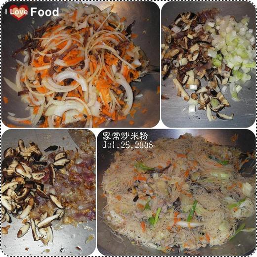 紅蔥頭炸好,放香菇絲跟蔥末下去,繼續爆香,然後我喜歡先炒蔬菜絲,洋蔥炒香之後再放肉絲下去炒,以免豬肉絲炒太久會乾硬(費工的話可以先過油),最後再放泡軟切段的米粉、高麗菜絲、泡香菇水、蔥段,以及少許香油、醬油、粗胡椒粒等調味料,大火翻炒幾下,就完成了。