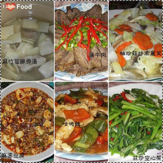 今天中午的菜色計有:滷牛腱切片、咕咾雞、麻婆豆腐、袖珍菇炒高麗菜、蒜炒空心菜、麻竹筍排骨湯,很簡單但是吃得很滿足的家常菜色。