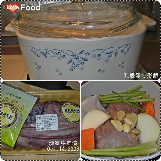 兩塊牛腱、半顆洋蔥對切、一大塊紅蘿蔔對切、一點薑片兩顆蒜頭、一小把芹菜梗、滷包,就是全部的材料,至於調味料,則只放了一點米酒、一點糖一點鹽,如此而已。(清燉的,千萬不要加醬油)