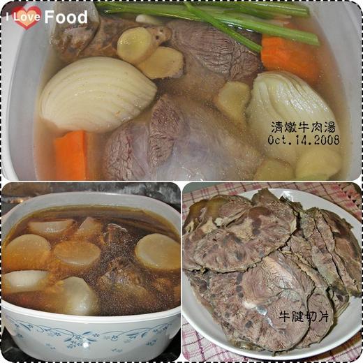 ↑↑↑左下:大約是昨晚關火時燉的程度,湯汁顏色已經是深咖啡色。右下:隔天下班回家,撈出兩大塊冰涼的牛腱,切片。(把切片的牛腱再丟回鍋裡一併熱湯,再吸收一次湯汁並加熱)
