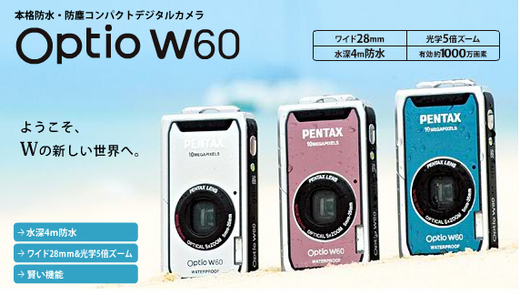 影像畫素為1000萬,裝載『防手震系統』、『最高 ISO6400 的感光度』、『28mm超廣角』,對水底或室內拍攝特別有利。防水的系統部分也新增了可在水深4m 進行連續水中攝影的防水設計,而機殼仍為JIS8級防水性能和JIS5級的防塵性能。相機設有臉孔辯識AF系統和多達 25 種的拍攝模式可選擇,即使是初學者亦可以輕易上手。Pentax Optio W60 是一台擁有高畫素與多功能的相機,也讓您省下買相機潛水盒的錢,帶給您的不只是高品質的影像,更是極為方便的使用功能!