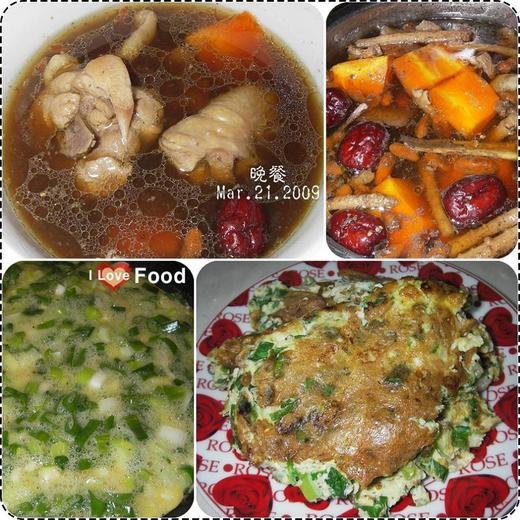 晚餐其他菜色:蔥花煎蛋(TACO喜歡煎得表皮焦酥、咬下去飽滿多汁)、燙地瓜葉,還有清燉藥膳雞湯。