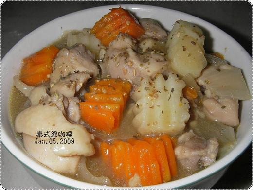 綠咖哩嘛~,當然要搭配帶皮的去骨雞腿肉囉~,非常鮮嫩的雞腿肉,好吃啊。