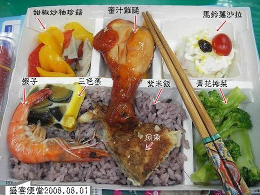 菜色通常是醬子,紫米飯(量不多)、肉類、蝦子一尾、魚片或花枝小卷類、馬鈴薯蛋沙拉或悶南瓜、蔬菜,比起一般的油炸類便當是健康許多....^^