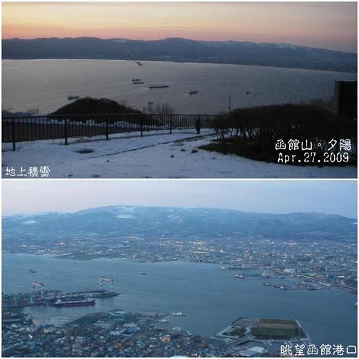 抵達函館山時,太陽剛落下,尚未完全天黑(請注意看--地上的積雪)。夜景來臨之前,可以眺望整個函館港灣。
